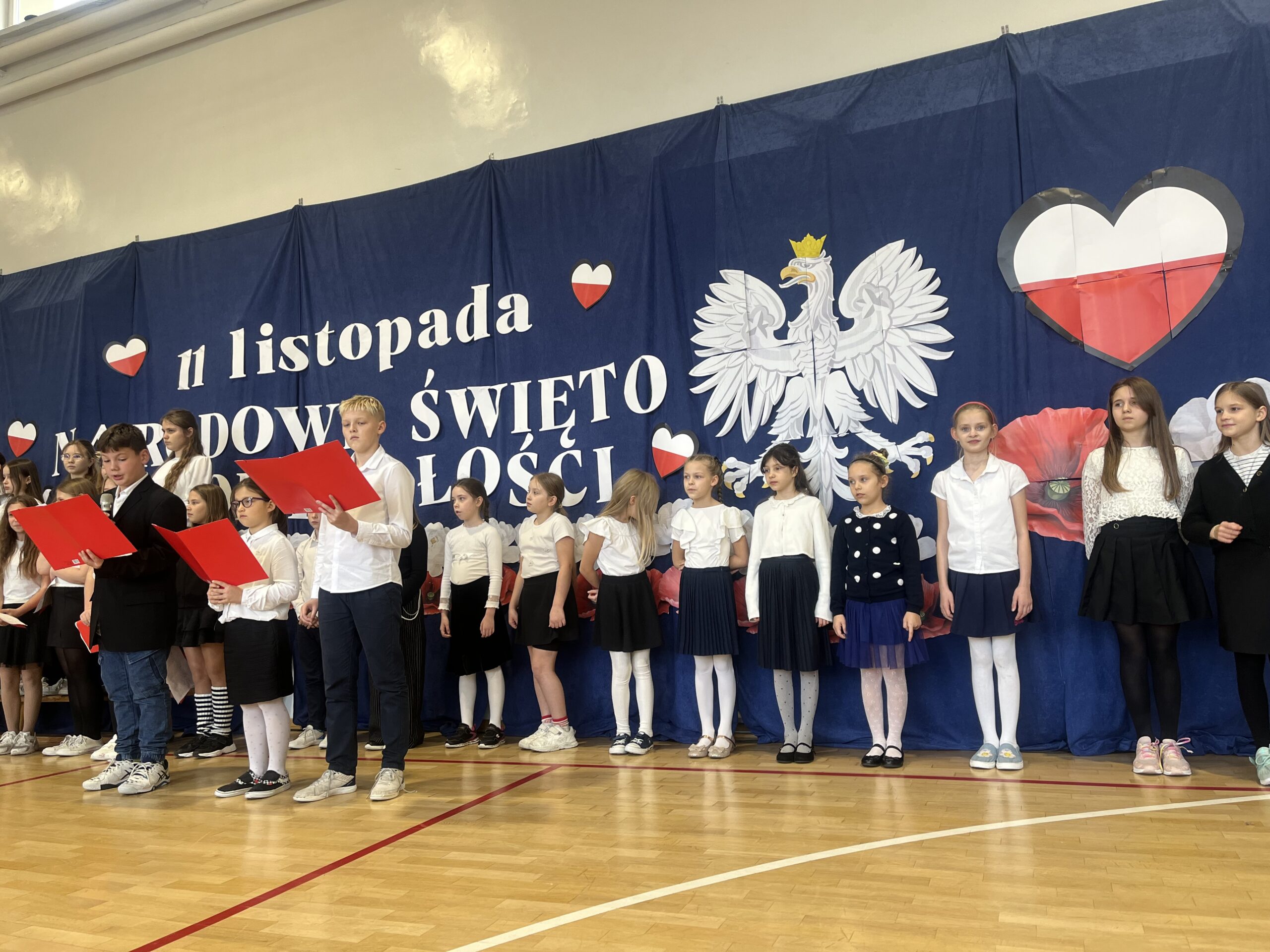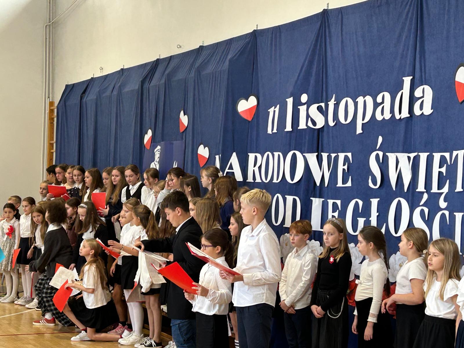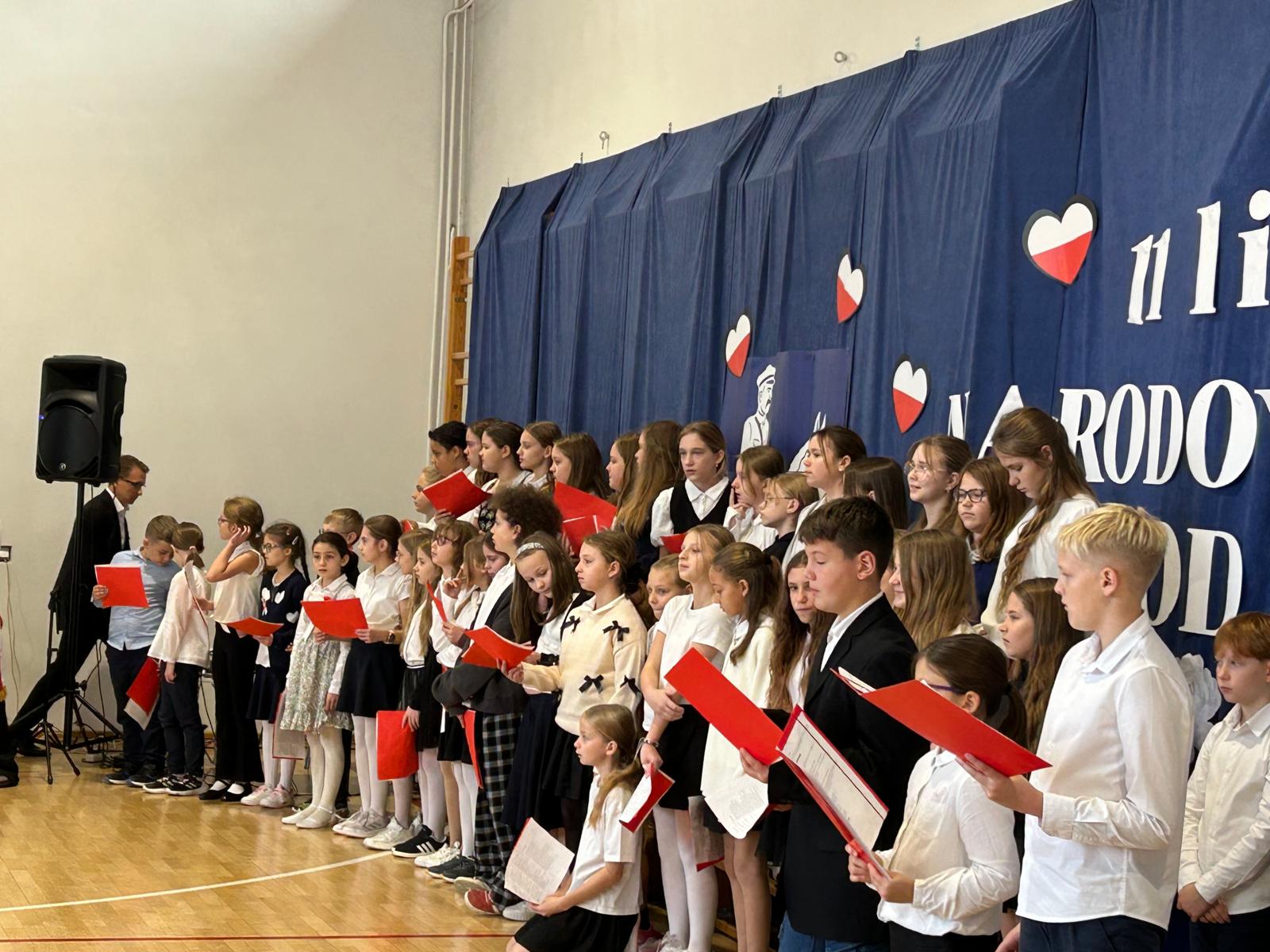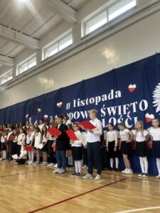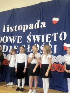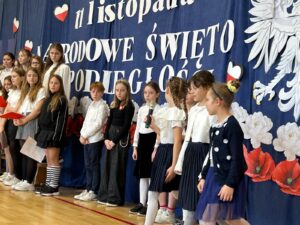 oraz przy udziale chóru szkolnego, a także uczniów klas 3b i 5c, mogliśmy przekonać się, że świętować niepodległość można również poprzez sztukę — muzykę, słowo i wspólne przeżywanie historii.
