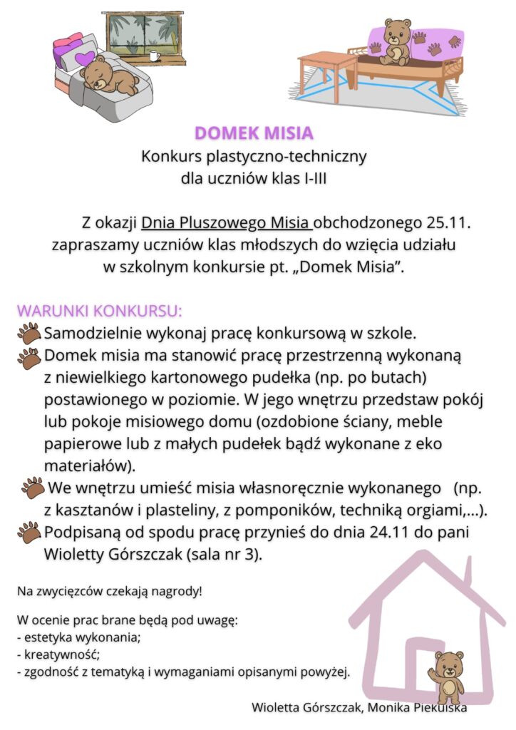 Z okazji Dnia Pluszowego Misia, obchodzonego 25 listopada, zapraszamy uczniów klas młodszych do udziału w szkolnym konkursie plastyczno-technicznym „Domek Misia”.